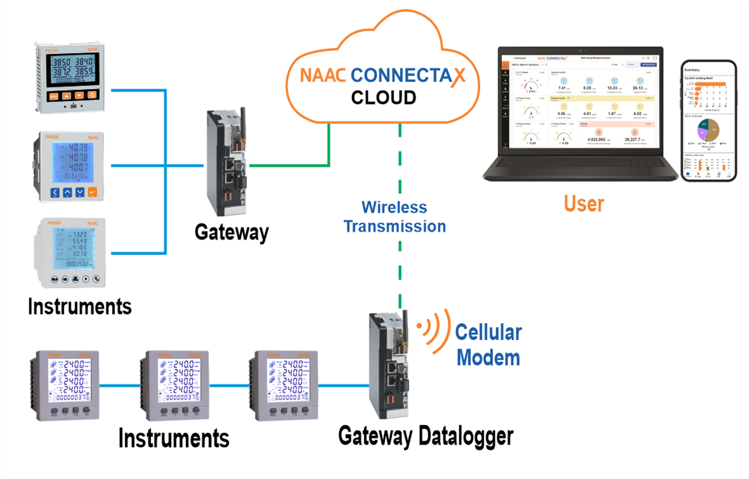 NAAC EMS uses an advance gateway for enhanced security and ease of use. Our gateway uses encryption and latest firewalls, keeping prying eyes away from your critical industrial data. The gateway features data logging capabilities making it a fail-safe solution for monitoring industrial devices. In case of monitoring remote devices, we offer a cellular modem which can be plugged onto the gateway. The combination of data logging and cellular makes our gateway a powerful tool for transmitting data in extreme environments.